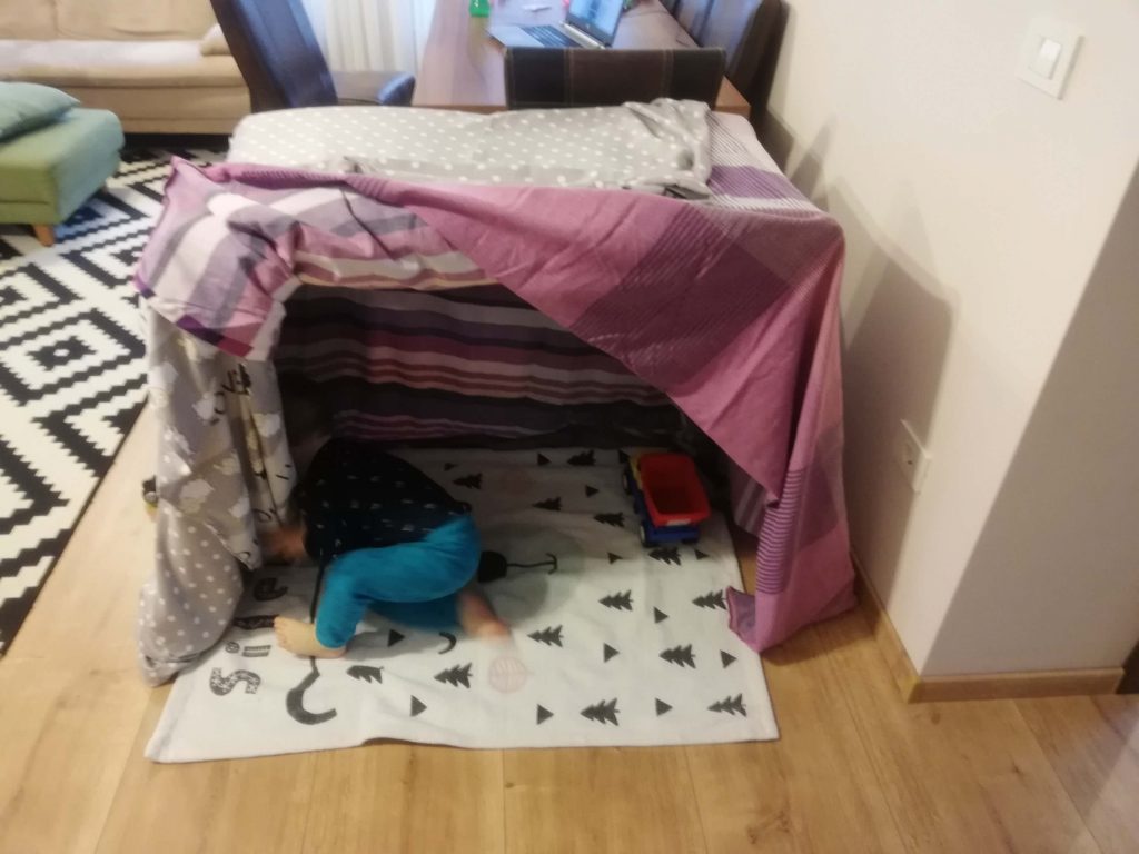 - I-am încropit un cort din uscătorul de rufe, peste care am pus haine de pat. Și-a mutat acolo 30% din jucării și a fost prins în activitate o vreme bună