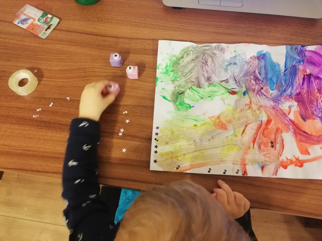 Pictura ocupă un loc de cinste la noi în casă. Tudor încă nu știe să picteze, doar împrăștie acuarele pe tot spațiul disponibil, așa că încerc să aduc mereu ceva nou, atât cât e posibil, în experiența sa.